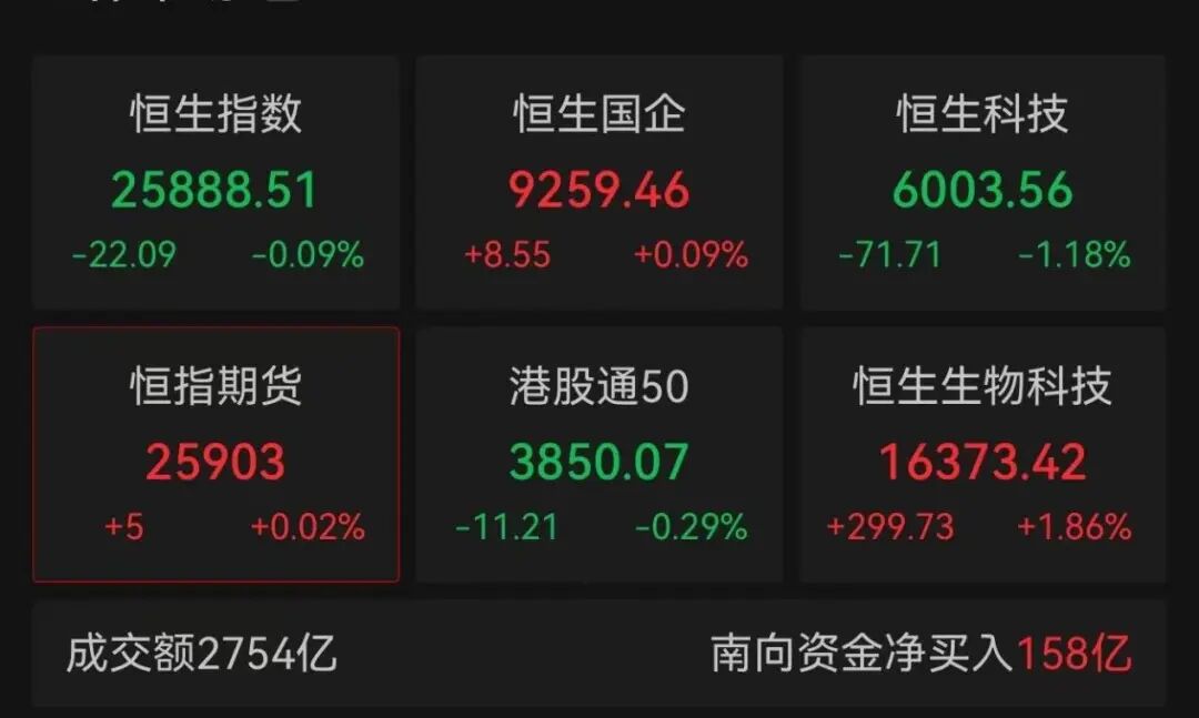 盘面上,银行、资源、公共事业等红利板块整体走强,支撑恒生国企指数翻红。恒生指数和恒生科技指数跌幅收窄,汽车、半导体、科网股拖累恒生科技指数表现。南向资金今日净流入158亿港元,港股全市成交额为2754亿港元。