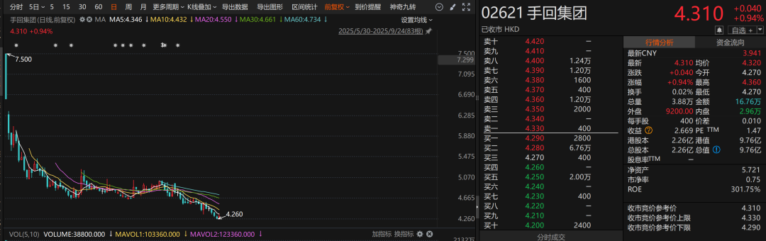 9月23日,手回集团股价报收4.27港元每股,收盘价创上市以来的新低。9月24日,手回集团股价小幅反弹,全天涨幅约0.94%,收盘价报收4.31港元每股,较发行价跌幅约46.66%。
