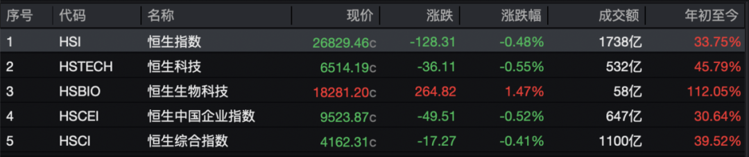 10月8日,港股三大指数集体下跌。恒生指数收跌0.48%,报26829.46点,恒生科技指数收跌0.55%,恒生国企指数收跌0.52%。全日大市成交额为1738亿港元。