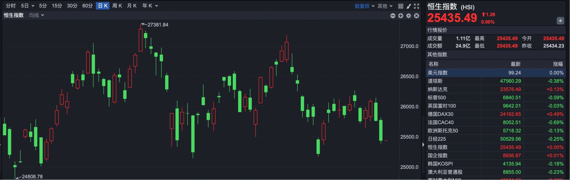 截至发稿,恒生指数报25435.49点,上涨1.26点,涨幅约0.00%。