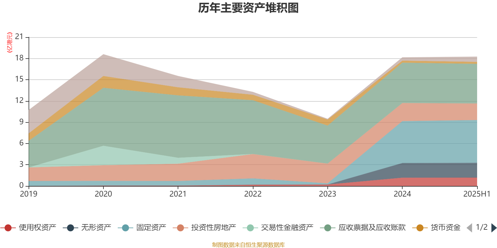 资产重大变化方面,截至2025年上半年,公司投资性房地产较上期末减少8.76%,占公司总资产比重下降1.3个百分点;应收票据及应收账款较上期末减少1.68%,占公司总资产比重下降0.69个百分点;固定资产较上期末增加2%,占公司总资产比重上升0.48个百分点;递延所得税资产较上期末减少23.94%,占公司总资产比重下降0.12个百分点。