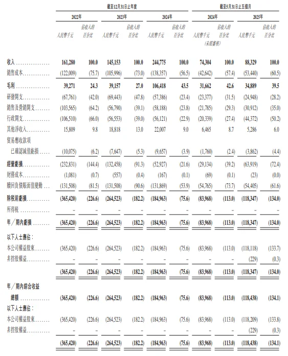 尽管往绩记录期间收入出现波动,但公司的毛利仍录得显著增长,由截至2022年12月31日止年度的人民币39.3百万元增至截至2024年12月31日止年度的人民币106.4百万元,年复合增长率为64.6%。截至2022年、2023年及2024年12月31日止年度的净亏损分别为人民币365.4百万元、人民币264.5百万元及人民币185.0百万元。