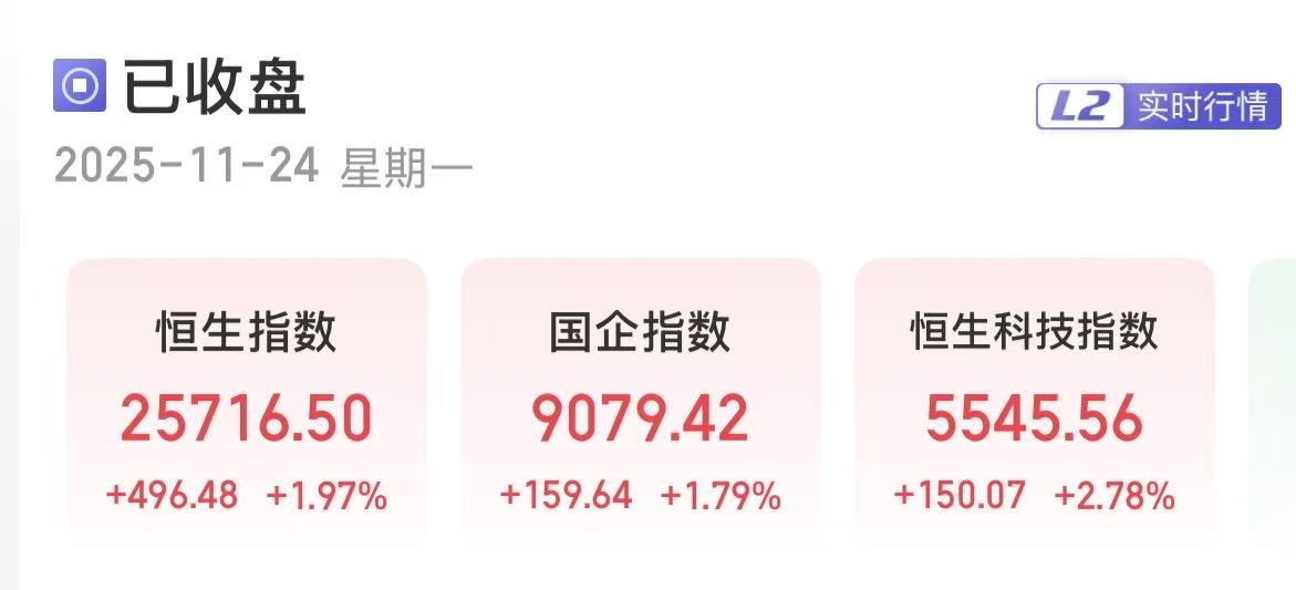 11月24日,港股三大指数收涨。截至收盘,恒生指数涨1.97%,报25716.50点;恒生国企指数涨1.79%,报9079.42点;恒生科技指数涨2.78%,报5545.56点。