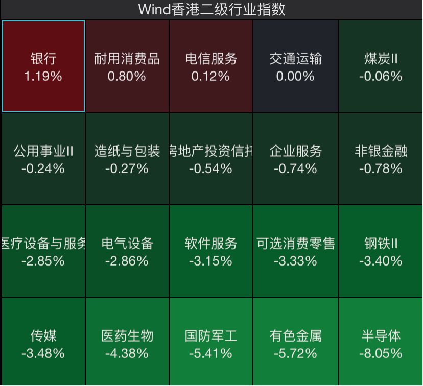 半导体板块遭遇重挫,华虹半导体(01347.HK)跌超13%,上海复旦(01385.HK)跌超9%,中芯国际(00981.HK)跌超8%。此外,有色金属、国防军工、医药生物等板块都跌幅较大。