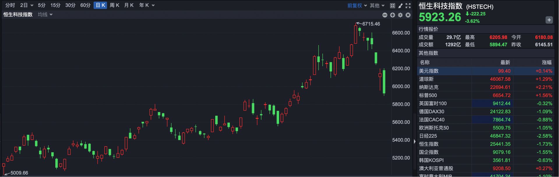 恒生科技指数跌幅比昨日更大,最终报收于5923.26点,下跌222.25点,跌幅达3.62%。