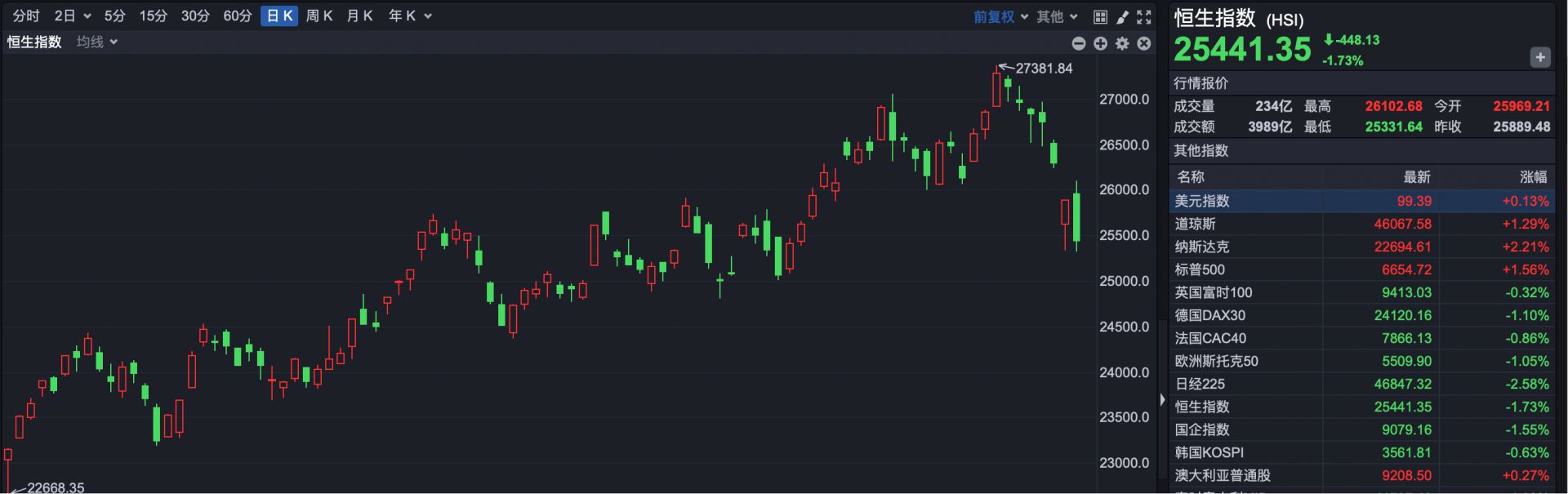 截至收盘,恒指报收于25441.35点,下跌448.13点,跌幅1.73%。