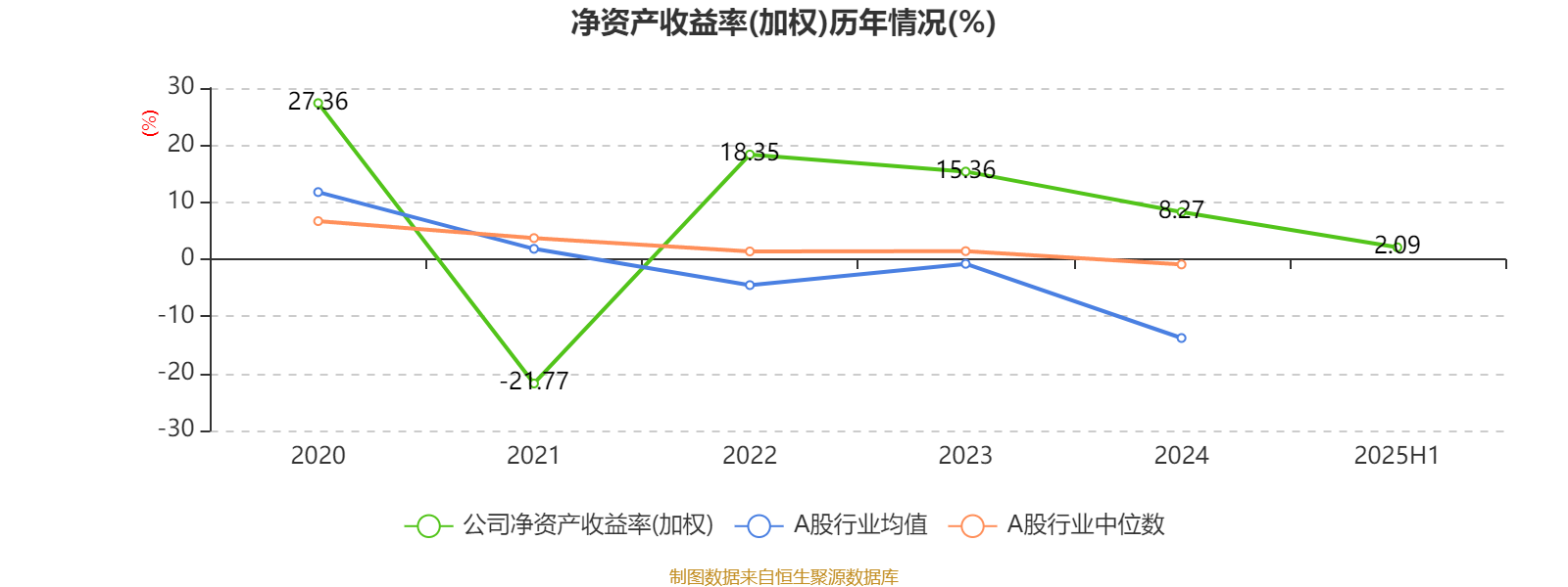 2025年上半年,公司平均净资产收益率为2.09%,较上年同期下降5.03个百分点。