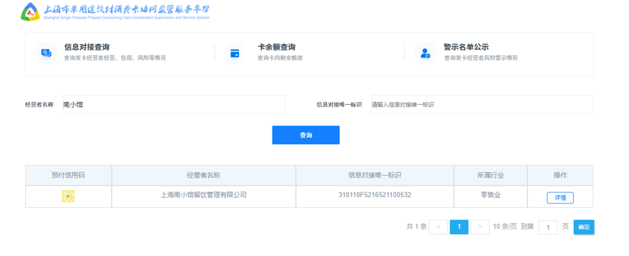上海市单用途预付卡协同监管服务平台对与小南国有关的两家备案企业的预付卡已经发出过“黄灯”风险提示。