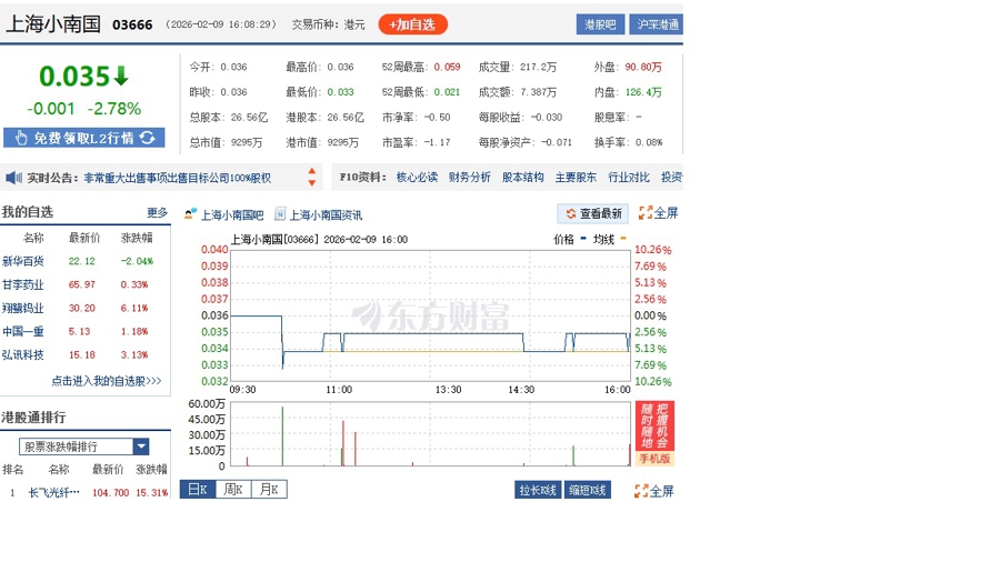 不过,自2017年起,上海小南国开始按下“闭店键”,当年该集团就关闭了7家门店。至2024年,上海小南国亏损超过8500万元;2025年中期,亏损额达1824.8万元。股价方面,2026年2月9日,上海小南国(证券代码:03666)报收0.035港元,当日跌幅为2.78%。