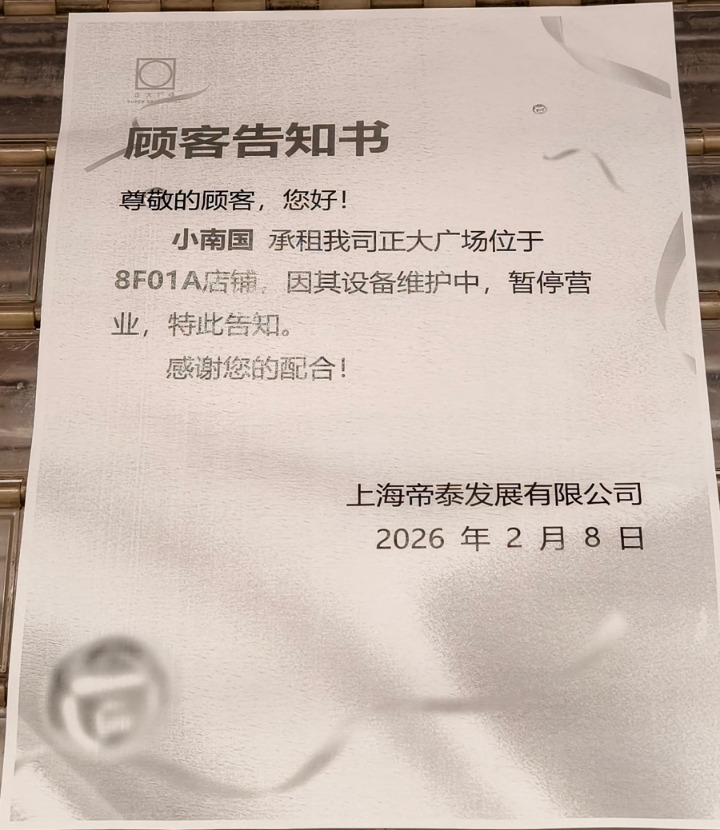 2月9日,解放日报·上观新闻记者走访陆家嘴商圈正大广场发现,该商场8楼的“上海小南国”餐厅已闭门谢客。门店大门紧闭,门上张贴着一份落款日期为2月8日的顾客告知书,注明“因设备维护中,暂停营业”。但据周边商户及该区域外卖员反映,该门店实际自2月7日(上周六)起就已停止营业,与告知书所述情况存在出入。