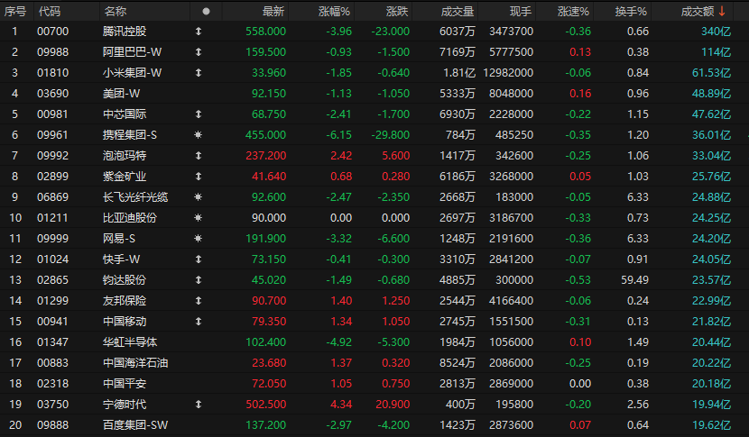 港股成交额前二十