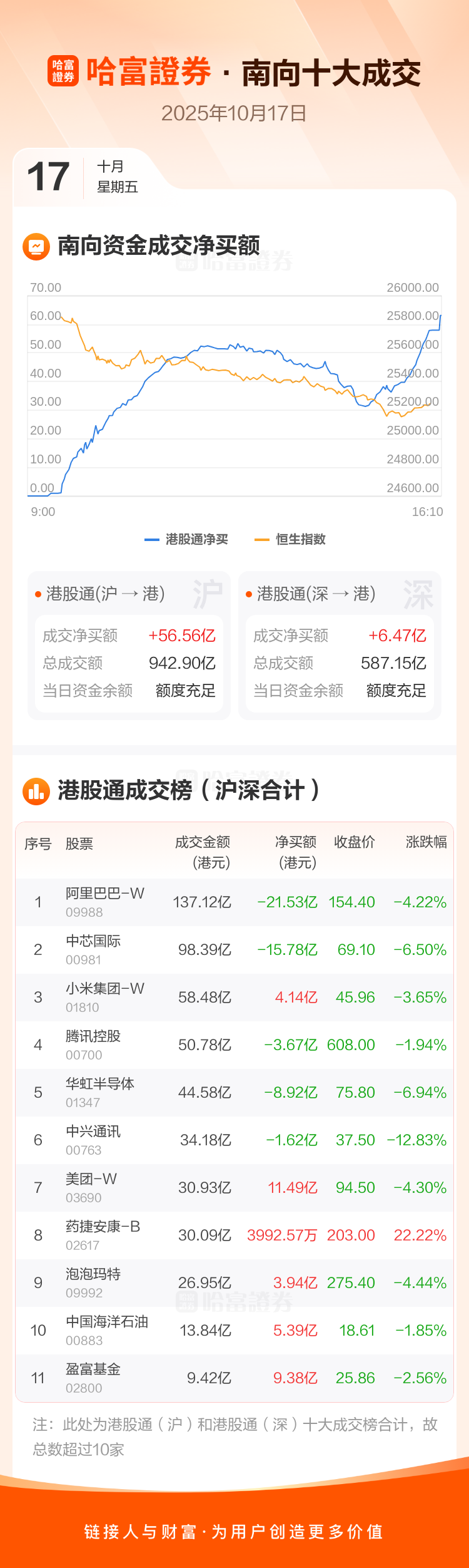 恒生指数10月17日跌2.48%,收报25247.1点。南向资金今日净买入港股63.03亿港元。南向资金今日成交额1530.05亿港元,港股大市成交3146.24亿港元。