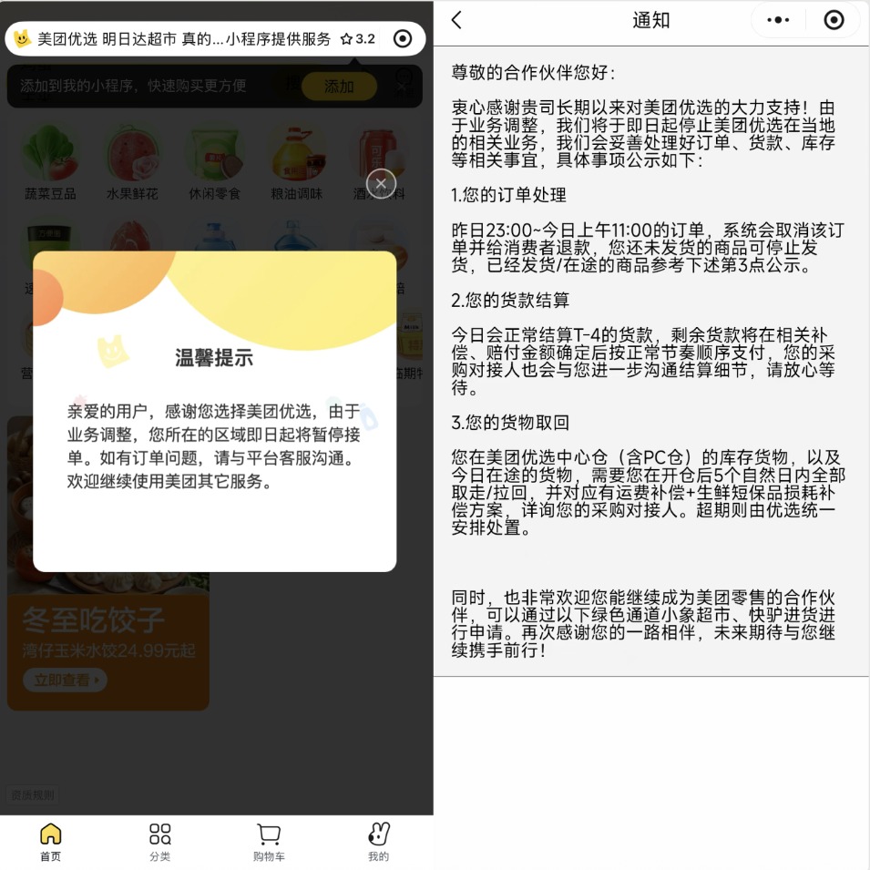 美团优选服务关停通知。美团优选用户及供应商供图。