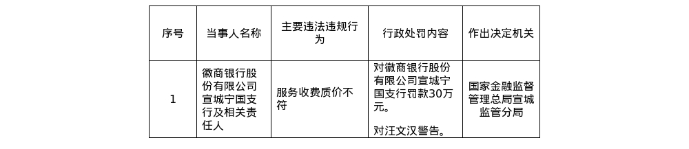 徽商银行宣城宁国支行被罚30万,涉服务收费质价不符