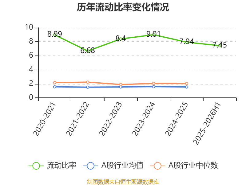 报告期内,公司流动比率为7.45,速动比率为6.9。