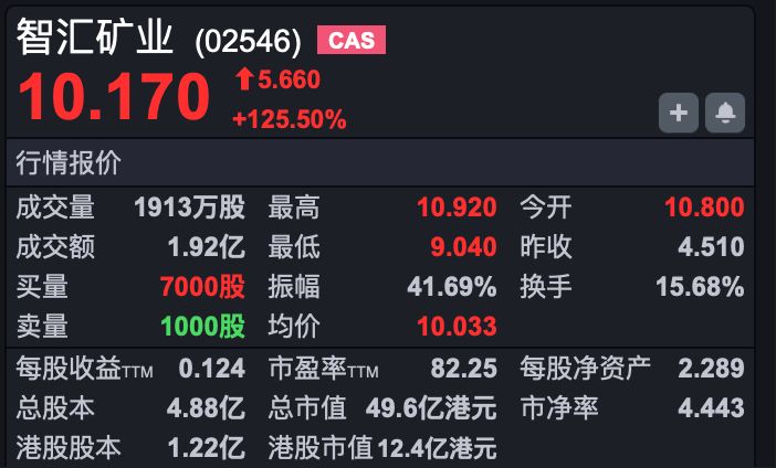 另一只新股智汇矿业(HK02546)获得市场追捧,早盘高开超139%,随后涨幅有所收窄。截至发稿,报10.17港元,上涨125.50%。