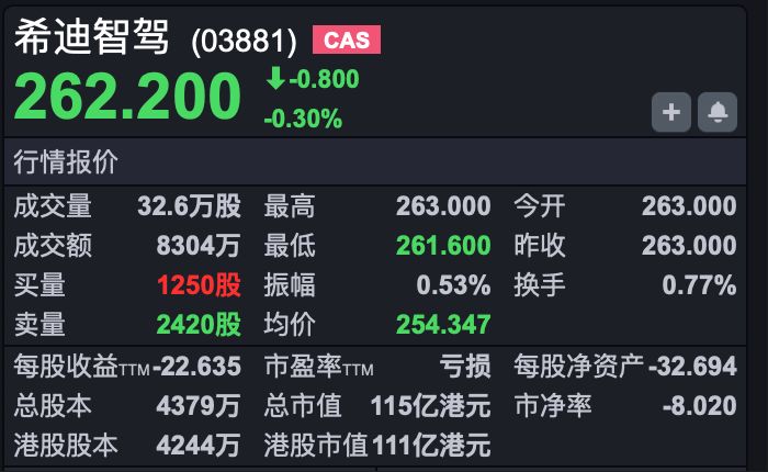 其中,希迪智驾(HK03881)早盘平开,但随后即跌破发行价。截至发稿,希迪智驾最低报261.6港元,下跌0.30%。