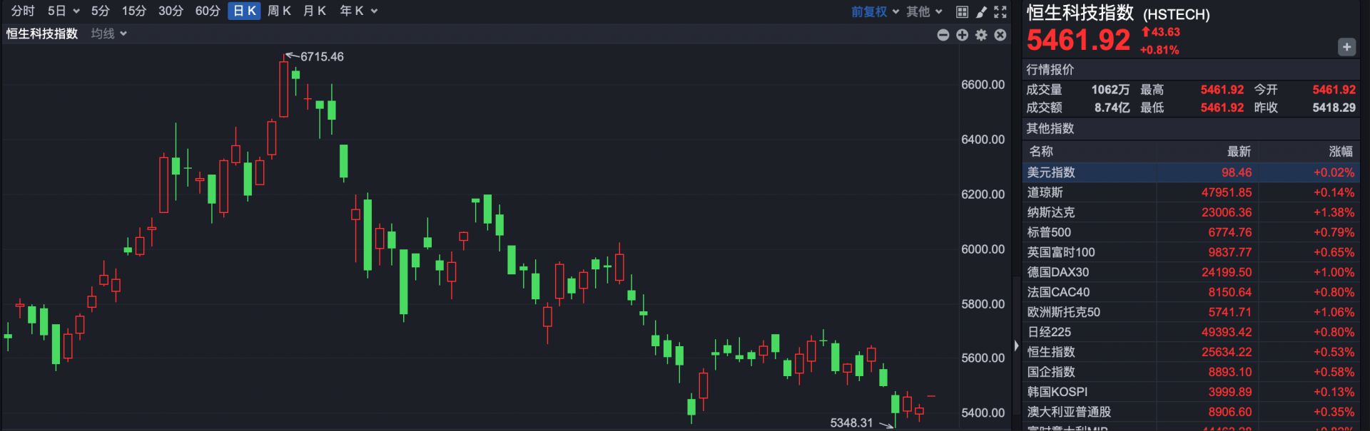 恒生科技指数报5461.92点,上涨43.63点,涨幅0.81%。