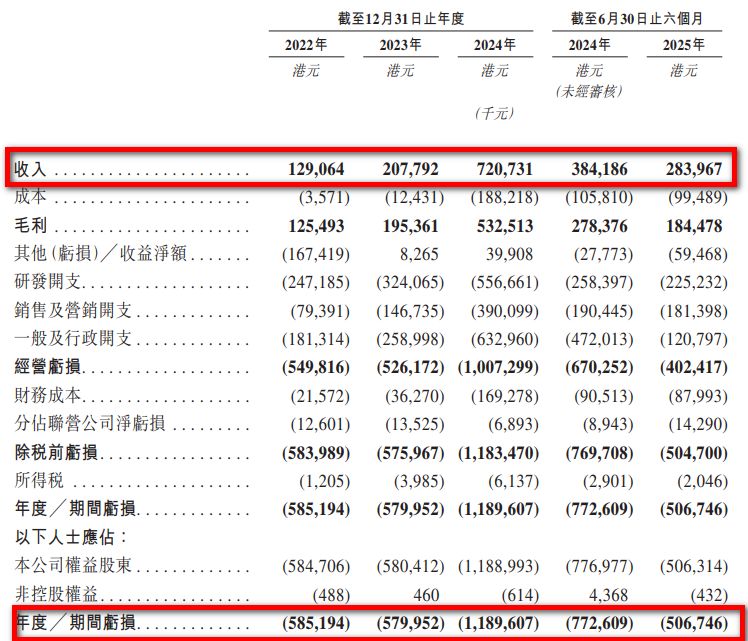 招股书显示,HashKey在2022年、2023年及2024年的收入分别为1.29亿港元、2.08亿港元及7.21亿港元,两年收入累计增长超458%,年复合增速超130%。同期,公司亏损分别为5.85亿港元、5.80亿港元和11.90亿港元,三年累计亏损超23亿港元。2025年上半年,公司收入同比下降26.1%至2.84亿港元,亏损5.07亿港元。
