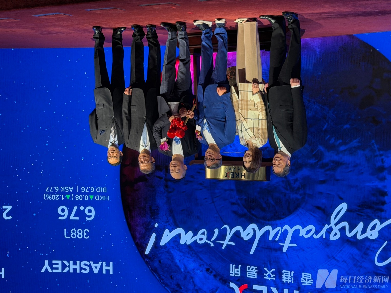 香港证监会主席黄天祐、港交所行政总裁陈翊庭、万向集团董事长鲁伟鼎、HashKey创始人肖风、香港财政司司长陈茂波、港交所主席唐家成(从左至右)共同为HashKey上市敲锣图片来源:每经记者李旭馗摄