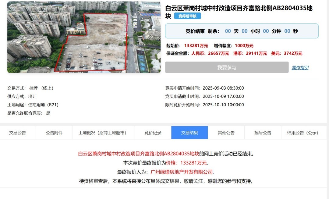 白云新城时隔四年再拍宅地,绿城以底价13.3亿元拿下
