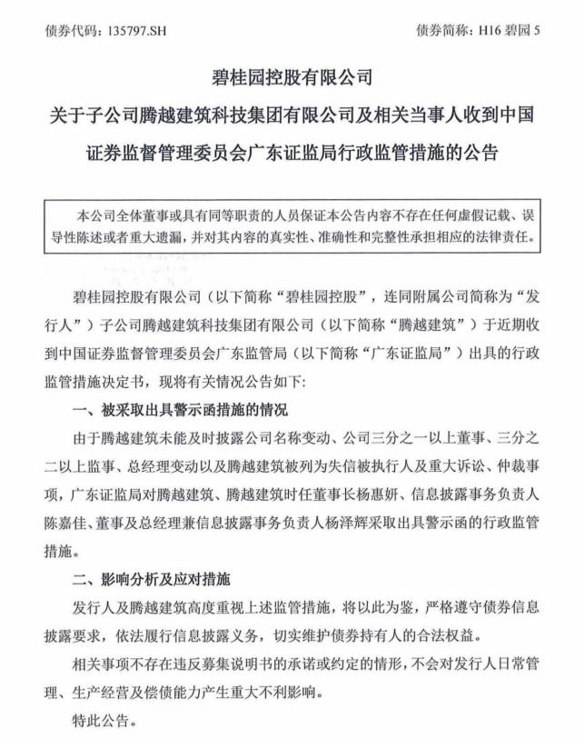 碧桂园:广东证监局对腾越建筑及相关当事人采取出具警示函行政监管措施