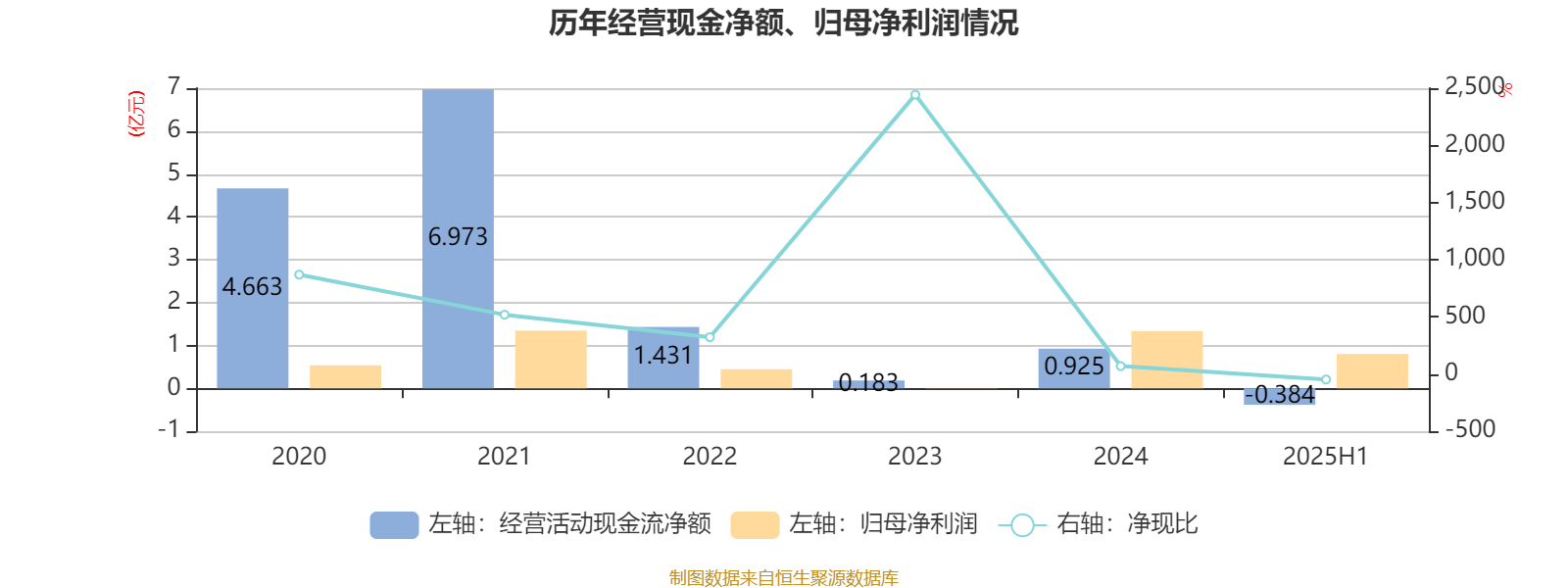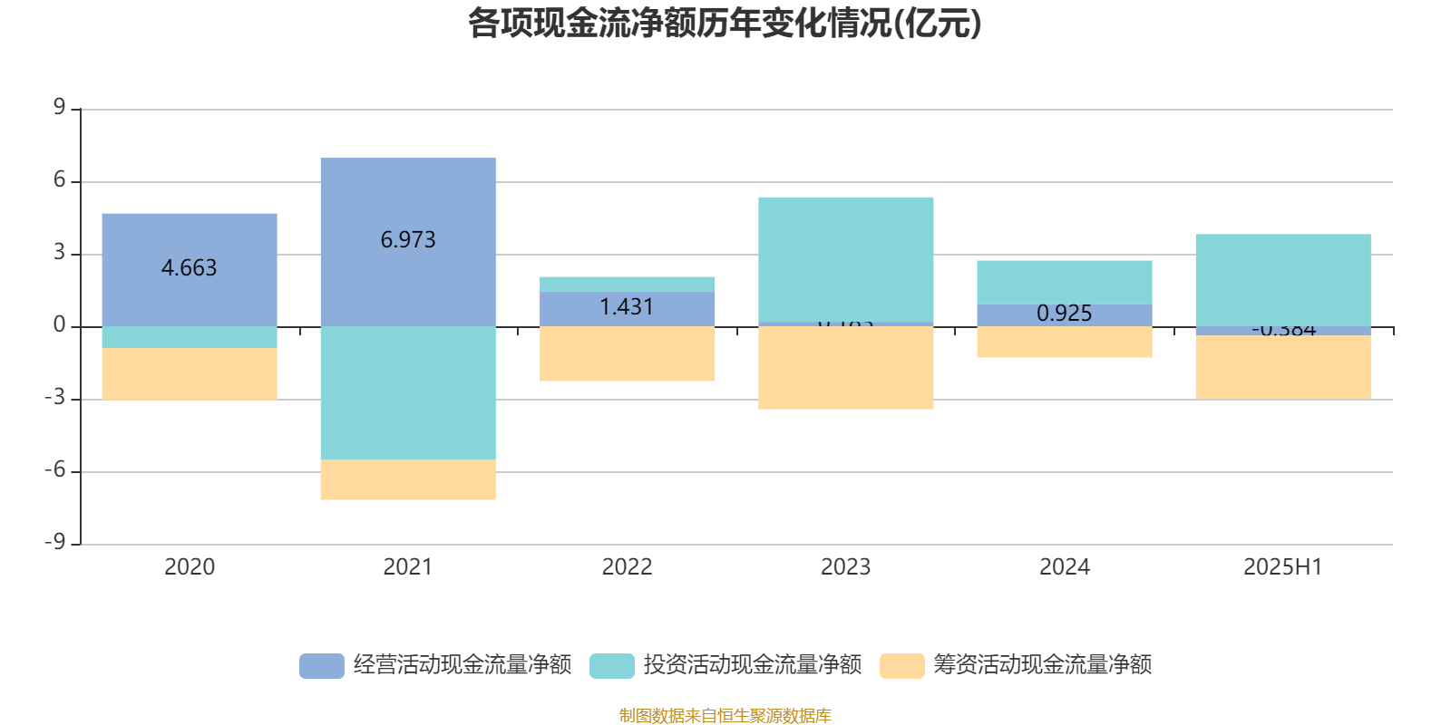 2025年上半年,公司经营活动现金流净额为-3839.9万元;筹资活动现金流净额-2.63亿元;投资活动现金流净额3.81亿元。