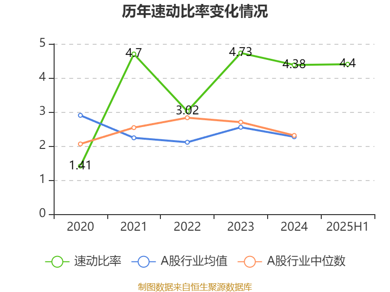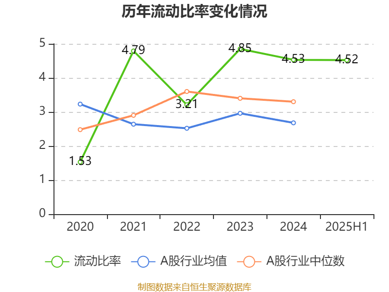 2025年上半年,公司流动比率为4.52,速动比率为4.4。