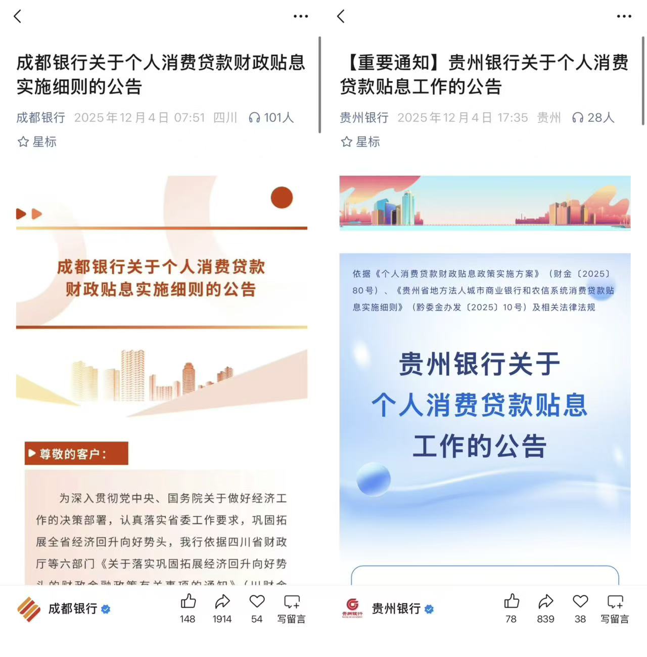 上证报中国证券网讯(记者徐潇潇)日前,继四川省之后,贵州省个人消费贷款财政贴息政策也陆续落地。贵州银行发布公告称,根据贵州省相关文件精神及要求,该行将依法有序推进个人消费贷款贴息政策的组织实施工作,自2025年12月1日起,可正式受理符合条件的消费贷款客户贴息。