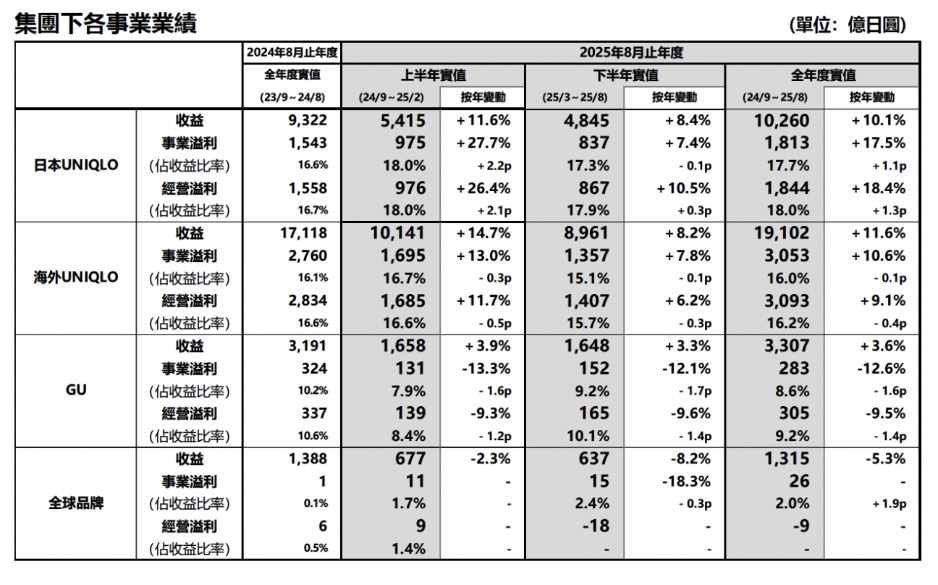 截至2025年8月31日的2025财年,迅销集团全年营收达到3.4万亿日元,同比增长9.6%;营业利润5511亿日元,同比增长13.6%;归属于母公司股东的净利润4330亿日元,同比增长16.4%。