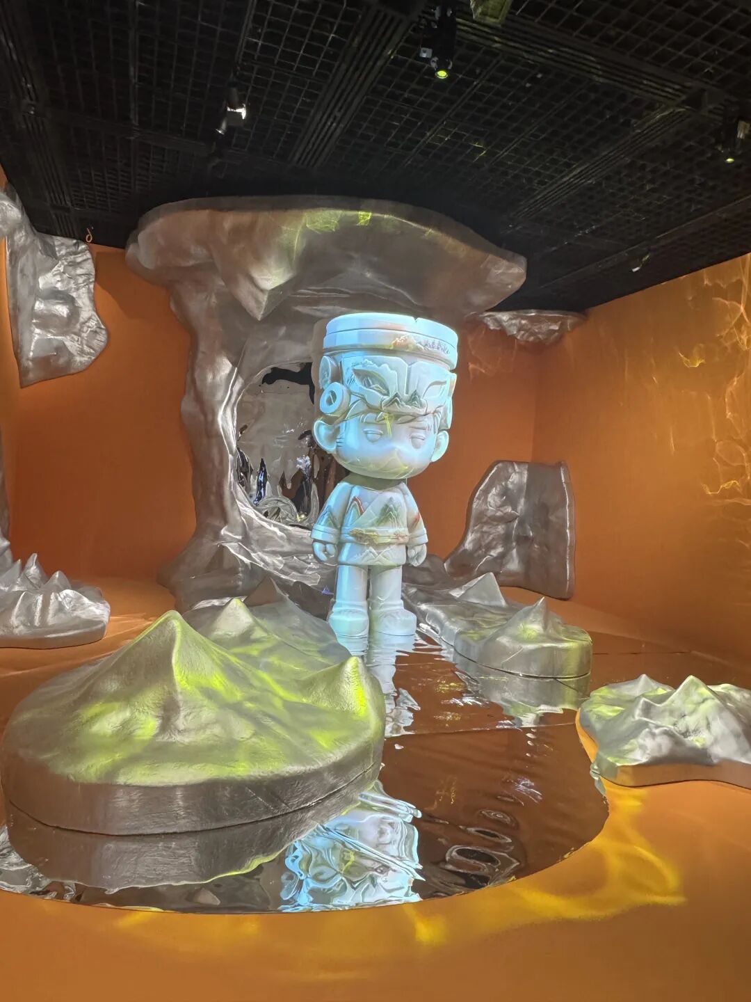 在“玉见未来”的未来考古概念展区,四千多年前的“玉神人”通过潮流转译,变成了一个戴着未来感冠帽的“周同学”巨像投影。