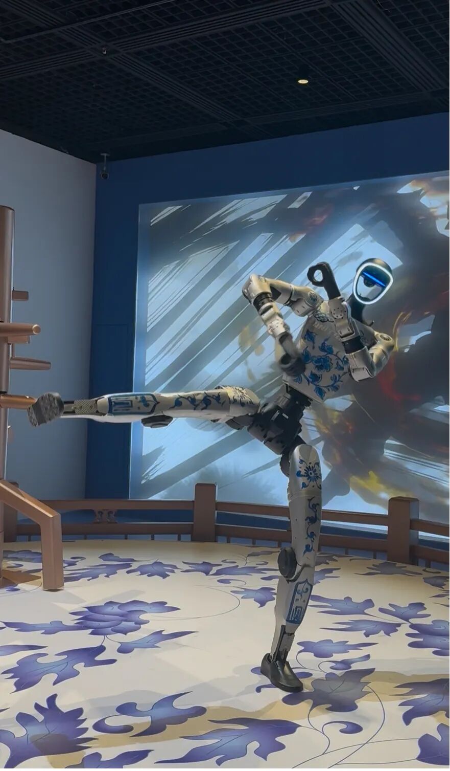 “我右拳打开了天化身为龙,把山河重新移动填平裂缝……”伴随周杰伦耳熟能详的歌曲《龙拳》响起,一台身涂青花纹饰的人形机器人拳臂生风,一套咏春拳打得刚猛凌厉。