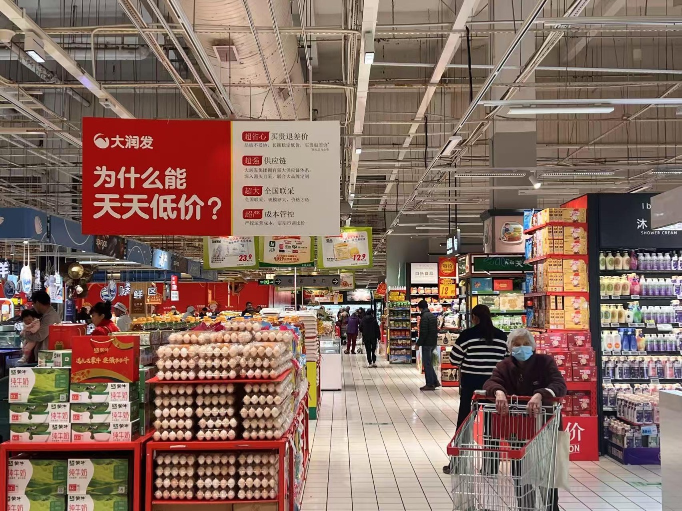 10月21日,在大润发上海门店,蓝鲸记者注意到,润发甄选系列摆在商场显眼处、配有明确标识,手撕式保鲜膜1.9元、一次性保鲜膜罩4.9元、手撕猪肉脯每袋11.8元,高鑫零售表示,多款爆款直接对标电商底价。