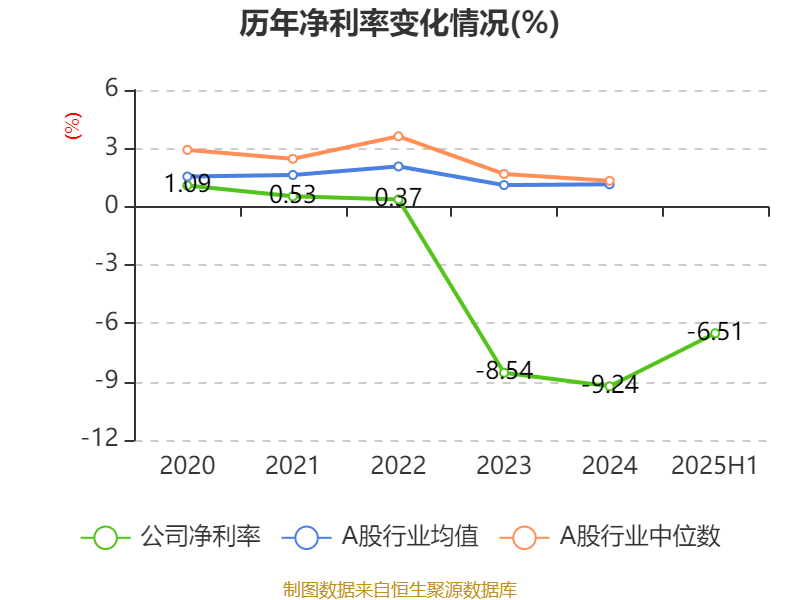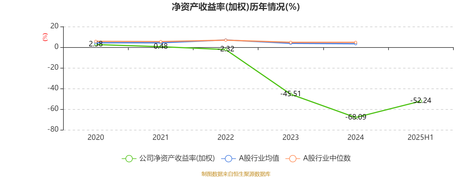 2025年上半年,公司平均净资产收益率为-52.24%,较上年同期下降33.55个百分点。
