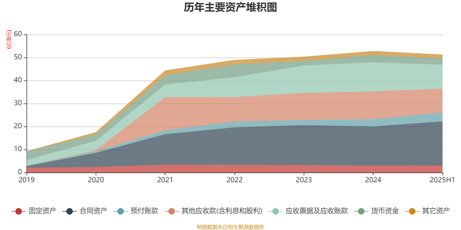 资产重大变化方面,截至2025年上半年,公司合同资产较上期末增加12.28%,占公司总资产比重上升5.06个百分点;应收票据及应收账款较上期末减少17.52%,占公司总资产比重下降3.61个百分点;其他应收款(含利息和股利)较上期末减少13.76%,占公司总资产比重下降2.55个百分点;预付账款较上期末增加19.82%,占公司总资产比重上升1.42个百分点。