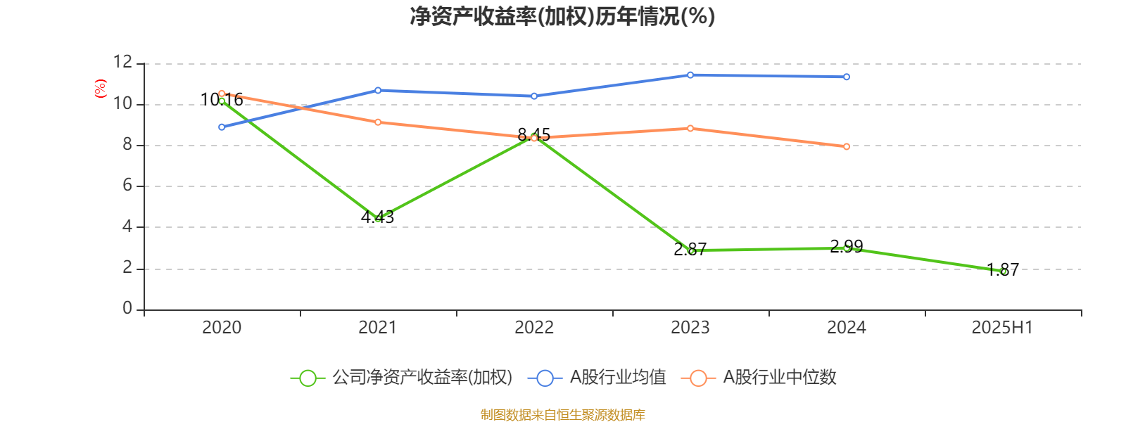 2025年上半年,公司平均净资产收益率为1.87%,较上年同期上升0.55个百分点。