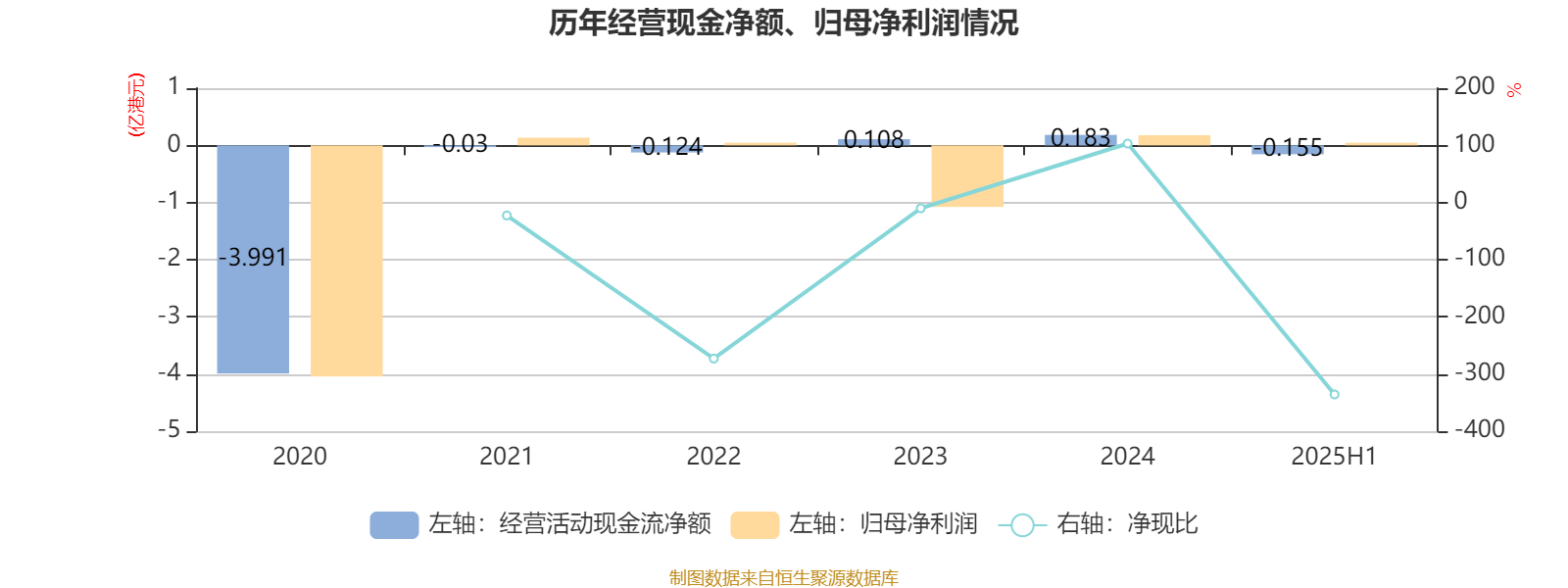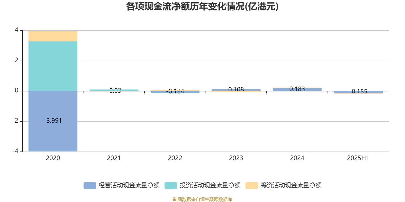 2025年上半年,公司经营活动现金流净额为-1547.3万港元;筹资活动现金流净额-327.5万港元;投资活动现金流净额1000港元。