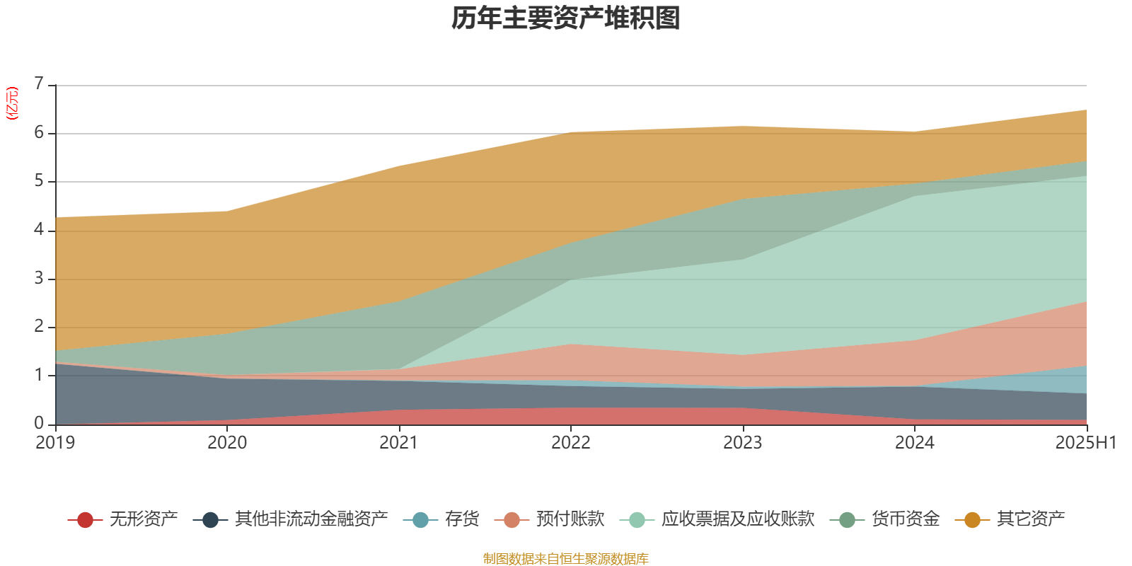 资产重大变化方面,截至2025年上半年,公司应收票据及应收账款较上期末减少12.84%,占公司总资产比重下降9.31个百分点;存货较上期末增加3626.03%,占公司总资产比重上升8.55个百分点;预付账款较上期末增加41.05%,占公司总资产比重上升4.86个百分点;其他非流动金融资产较上期末减少19.14%,占公司总资产比重下降2.77个百分点。