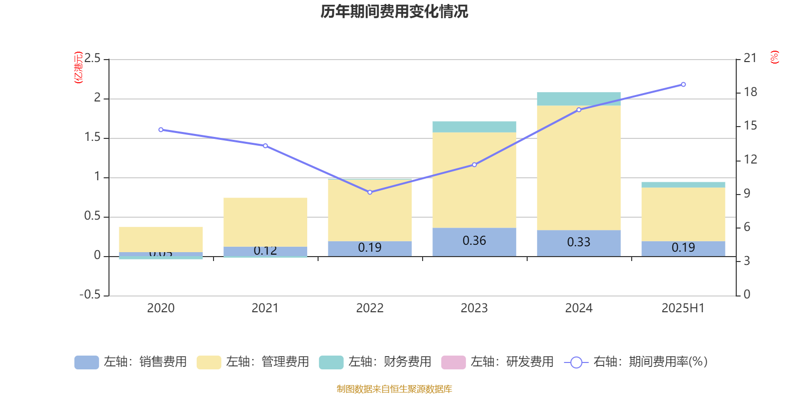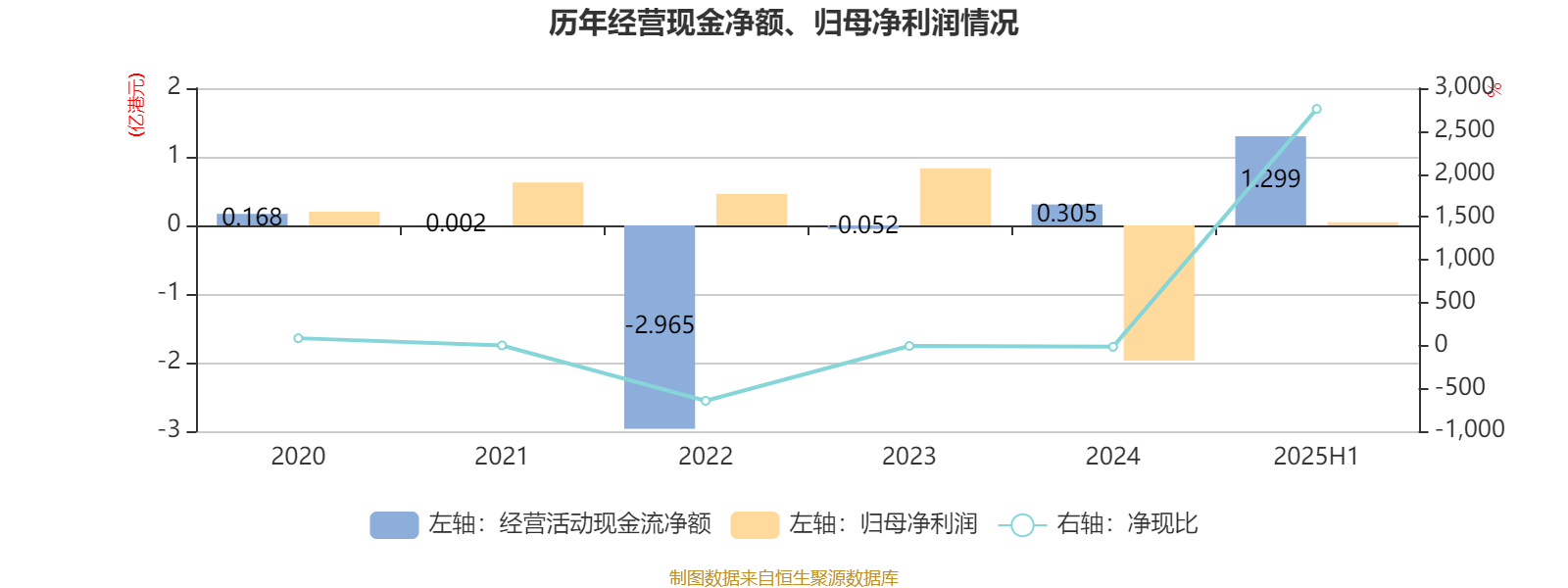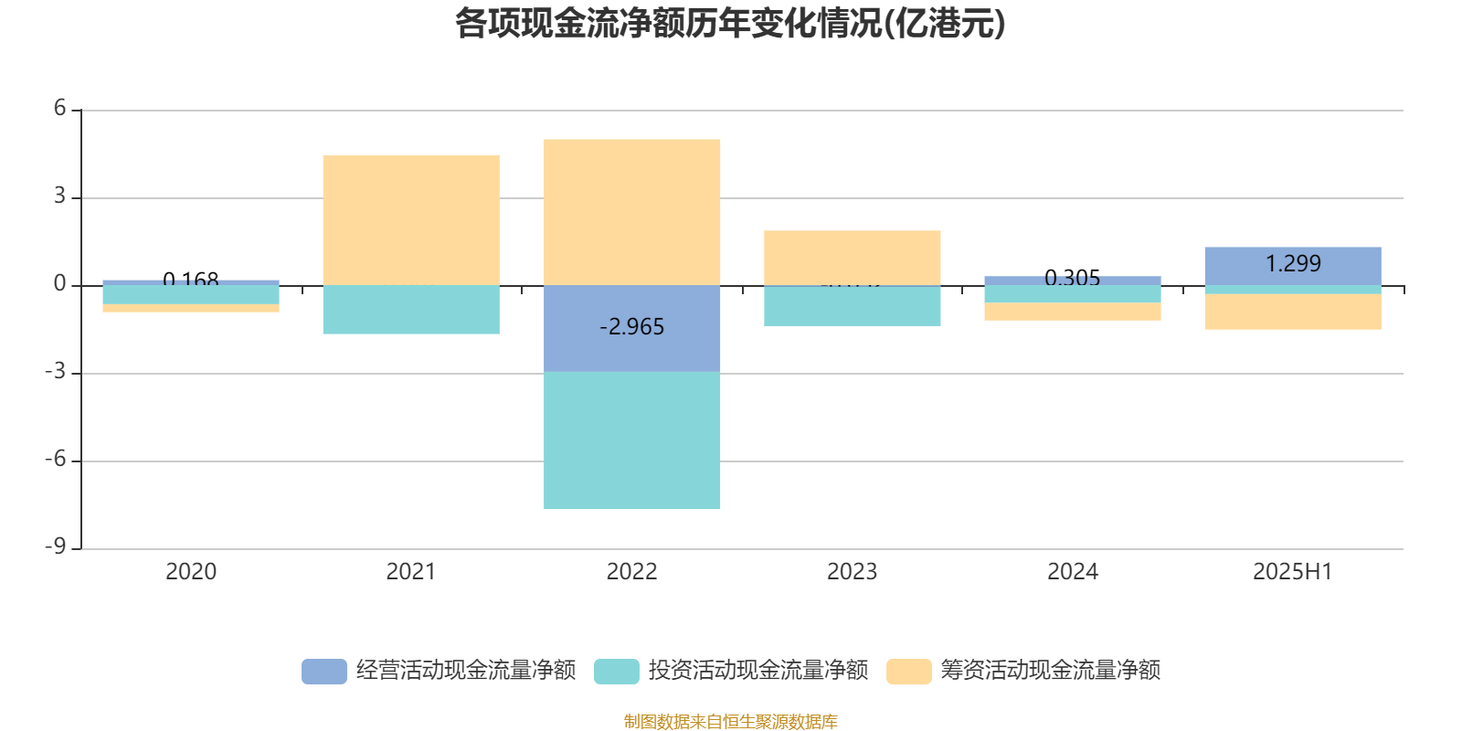 2025年上半年,公司经营活动现金流净额为1.3亿港元;筹资活动现金流净额-1.21亿港元;投资活动现金流净额-3066.7万港元。