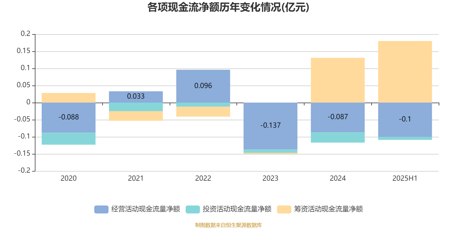 2025年上半年,公司经营活动现金流净额为-996.1万元;筹资活动现金流净额1804万元;投资活动现金流净额-88.1万元。
