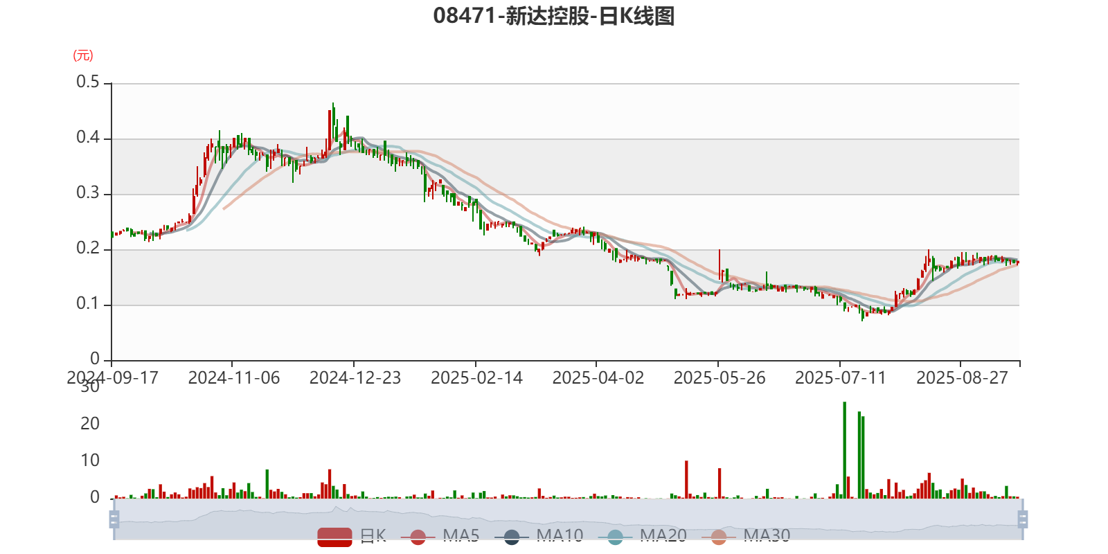 中证智能财讯新达控股(08471)9月17日披露2025年中期报告。报告期内,公司实现营业收入3784.1万元,同比下降4.7%;归母净利润亏损530.2万元,上年同期亏损648.5万元;经营活动产生的现金流量净额为-996.1万元,上年同期为-1642.4万元;据报告显示,新达控股基本每股收益为-0.005元,平均净资产收益率为-12.88%。