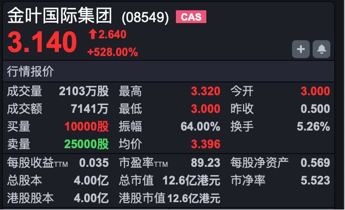 截至发稿,金叶国际集团报3.14港元,上涨528%。