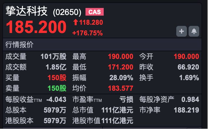 此外,今日另一只上市的新股挚达科技(02650.HK)开盘后上涨168%,报180港元。挚达科技以智慧家用电动汽车充电桩为切入点,构建了由产品、服务及数字化平台构成的“三位一体”电动汽车家庭充电解决方案。