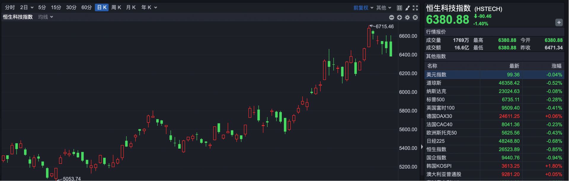 恒生科技指数报6380点,下跌90点,跌幅1.40%。