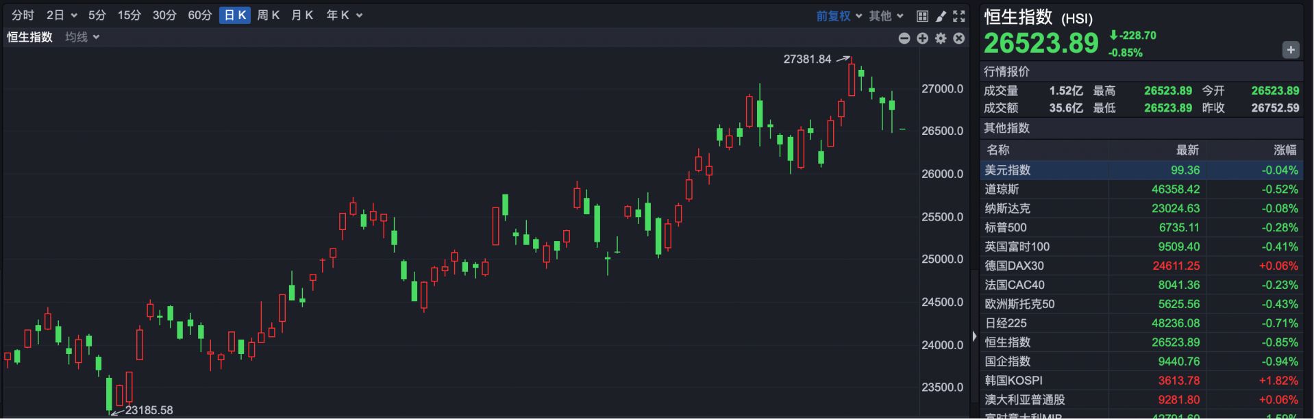 截至发稿,恒生指数报26523点,下跌228点,跌幅0.85%。