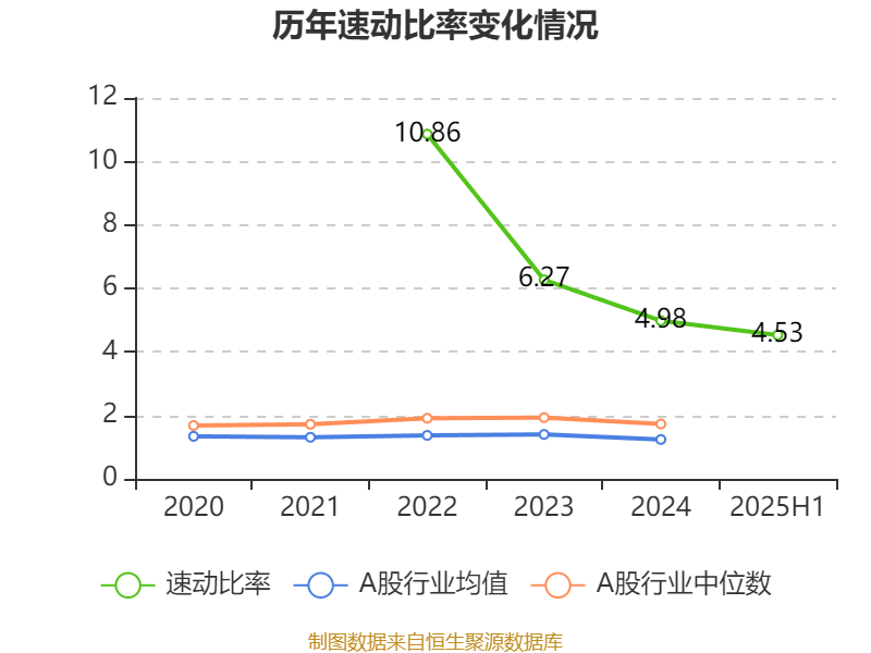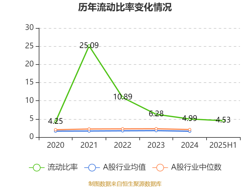 2025年上半年,公司流动比率为4.53,速动比率为4.53。