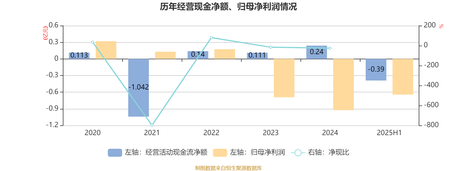2025年上半年,公司经营活动现金流净额为-3896.8万元;筹资活动现金流净额-1295.6万元;投资活动现金流净额-1130.2万元。