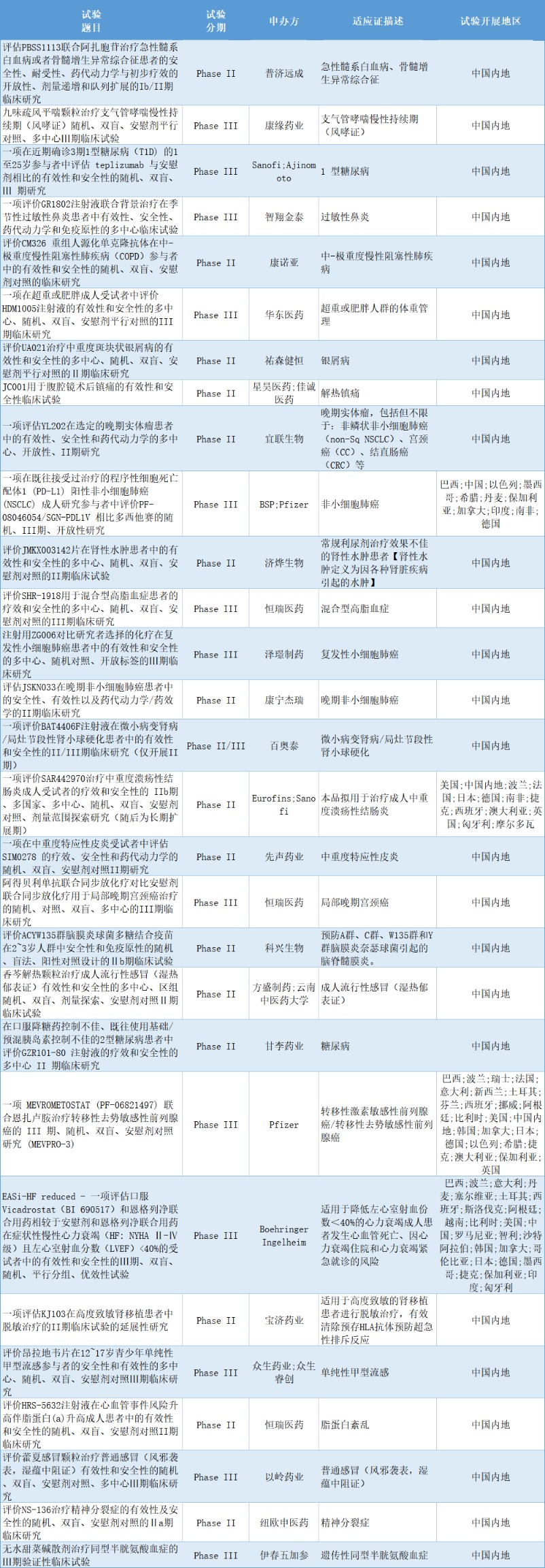 根据医药魔方提供的数据,9月22日至9月26日,国家药品监督管理局药品审评中心共披露117条临床试验登记信息。其中,有29条处于临床试验II期及以上的创新药新登记临床试验信息,主要针对肿瘤、自身免疫疾病、消化系统疾病等领域。