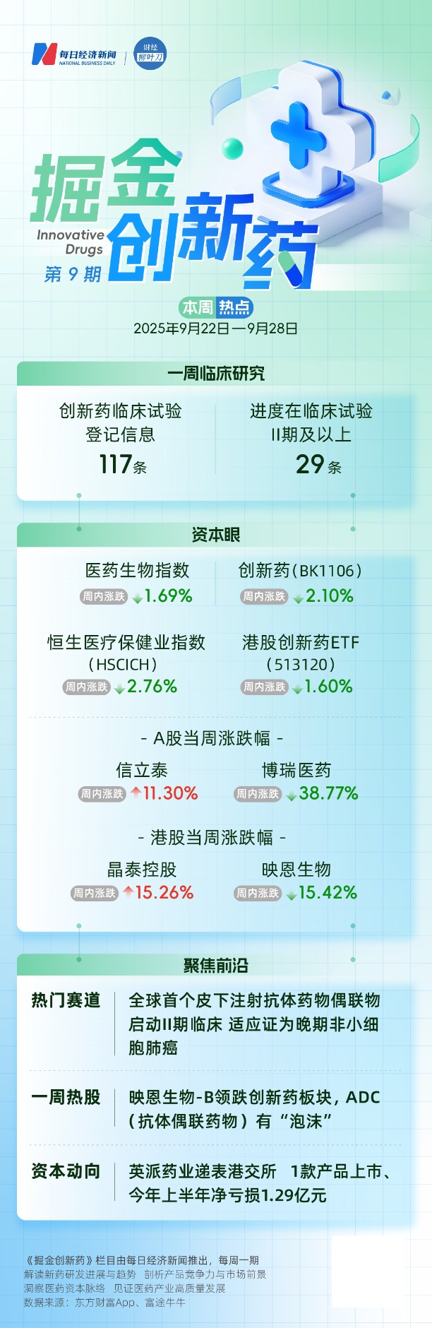 9月22日至9月26日,医药生物指数下跌1.69%,跑输上证指数1.04个百分点。创新药(BK1106)周内下跌2.10%。恒生医疗保健业指数(HSCICH)周下跌2.76%,港股创新药ETF(513120)周内下跌1.60%。
