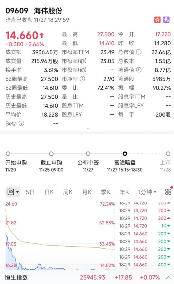 11月27日晚间,即将正式登陆港股市场的中国第二大电容器薄膜制造商——海伟股份进入暗盘阶段。富途牛牛显示,海伟股份在本次暗盘中,开盘后一度冲高大涨超90%,随后一路下滑,最终仅收涨2.66%。